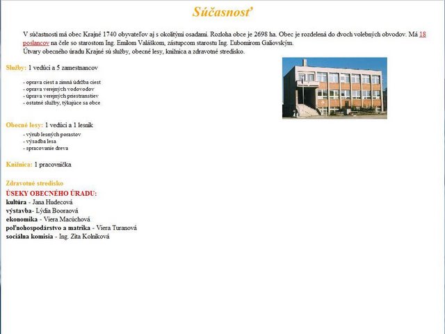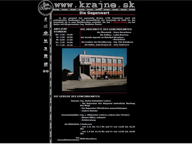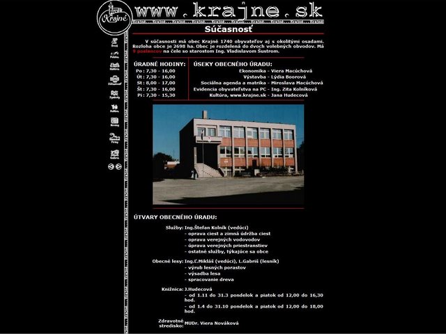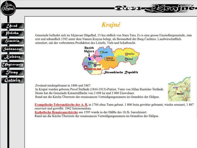 Internetová stránka obce oslávila v máji svoje 10 výročie „narodenia“. Pôvodnú stránku urobila Ivana Gáliková ako SOČku (Stredoškolskú odbornú činnosť) a potom ju obhajovala ako svoju maturitnú prácu, v máji 2000 (foto 1 až 4). Koncom decembra bola zaregistrovaná oficiálna stránka www.krajne.sk na Internete ako doména 2. úrovne na školskom serveri, spoločnosti Nextra. Stránku doplnil a upravil Ladislav Gálik. Garantom tejto stránky už bol obecný úrad – starosta obce, Ing. Emil Valášek. Novú podobu dostala stránka ako súťažná práca „Miesto ktoré chcem ukázať svetu“ v projekte Infovek, v júli 2001. Webmaster Ladislav Gálik v súťaži neuspel, hoci v škole stránka slúžila ako vzor tvorby stránok, čo ho ešte viac povzbudilo hľadať nové štýly, obsahové a grafické stvárnenie stránky (foto 5 až 10). Na prevádzku, za uloženie stránky v školskom serveri, finančne prispeli na sponzorský účet SPŠE štyria sponzori z našej obce.