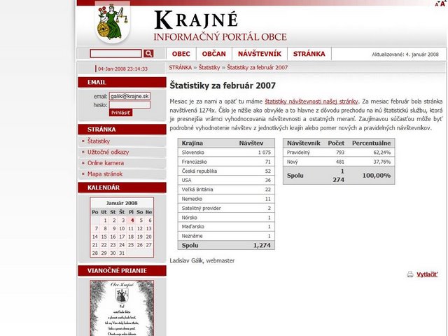 V tomto roku sme rozšírili našu stránku o videá, do konca mája bolo zverené 14 záznamov. Najväčšiu návštevnosť má video „Fašiangy a tradičné pochovávanie basy v Krajnom 2010“. O návštevnosti stránky tu nemusím písať, kto sa zaujíma, pozrie si v štatistikách vedených od januára 2007. Najvyššia návštevnosť bola v decembri 2009, hlavne zásluhou kultúrnych a spoločenských podujatí, z ktorých bol najatraktívnejší priamy prenos z kostola, Vianočný koncert Sisy Sklovskej. Ďakujeme všetkým, ktorí sa na projekte podieľali.