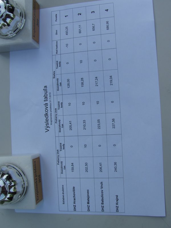Hoci podľa tabuliek bol najlepším DHZ Hrachovište, starosta odovzdal všetkým zborom ceny obce Krajné s tým, že všetci zvíťazili. Celé popoludnie bolo príjemné počasie, čo sa odrazilo aj v dobrej návštevnosti podujatia. Dobrý guláš a ostatné občerstvenie pre všetkých záujemcov hasičských podujatí, šíri hasičom dobré meno. Najbližšie stretnutie hasičských zborov bude 21.8.2010 v Matejovci, kedy DHZ Matejovec pripravuje oslavy 80. výročia založenia zboru.