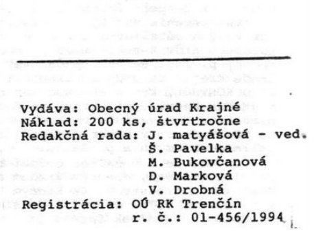 Na začiatku roka 1994 dostali obyvatelia obce Krajné do rúk prvé číslo Krajnianských novín. Možno niekto ho má odložené, možno že u niekoho je založené kopou iných novín, ale pravdepodobne väčšina novín je v nenávratne. Pretože existuje archív, dajú sa všetky dokumenty minulej doby vrátiť do života. Postupne budeme dopĺňať zložku našej stránky chýbajúcimi číslami novín tak, aby boli kompletné všetky ročníky. Privítali by sme, ak nájdete doma predchodcov Krajnianských novín, Krajňanské novosti, alebo noviny družstevníkov – rovnosť a poskytnete ich k naskenovaniu.